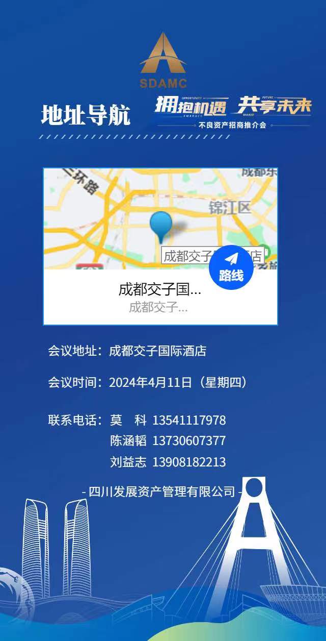 4月11日,四川發(fā)展資產(chǎn)管理有限公司將在成都高新區(qū)交子國(guó)際酒店舉辦“2024年不良資產(chǎn)招商推介會(huì)”,誠(chéng)邀您的參與。