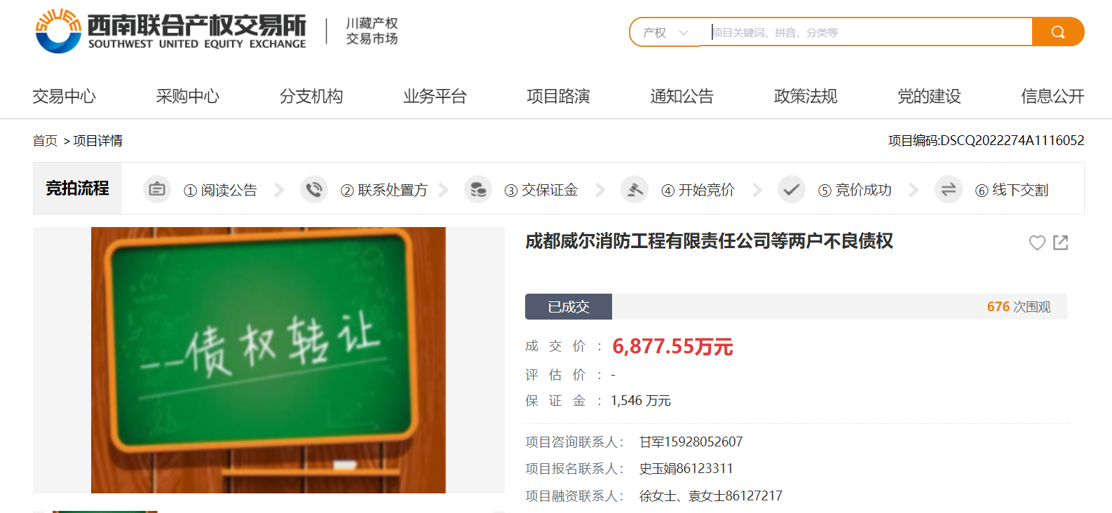 12月30日,該專區(qū)“成都威爾消防工程有限公司等兩戶不良債權(quán)”以6877.55萬元成交,實(shí)現(xiàn)溢價(jià)處置,較掛牌價(jià)溢價(jià)1725萬元,溢價(jià)率達(dá)33%,較預(yù)計(jì)回現(xiàn)價(jià)溢價(jià)3512萬元,溢價(jià)率達(dá)104%,首單業(yè)務(wù)取得圓滿收官。